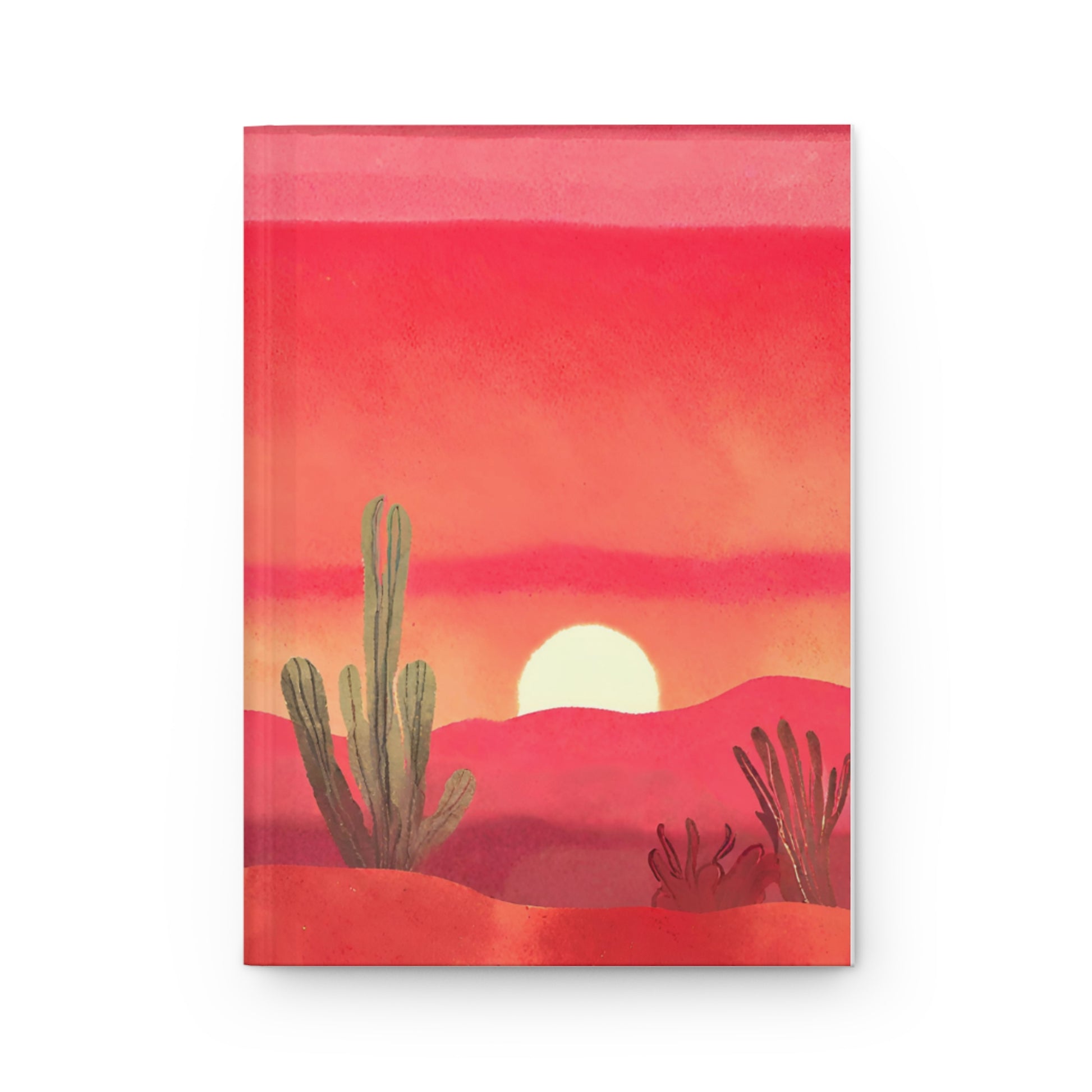 A small hardcover journal wrapped in a warm desert sunset. The matte-laminated cover softens the bright, watercolor-like hues as a round sun sinks behind rolling dunes and lone cacti. Inside, 150 lined pages lie on a flexible sewn spine that opens flat for easy writing, while perforated sheets let you detach notes without tearing the whole book. The full-wrap print keeps the scene uninterrupted across front, spine, and back for a cohesive, pocket-sized companion that feels both durable and personal.