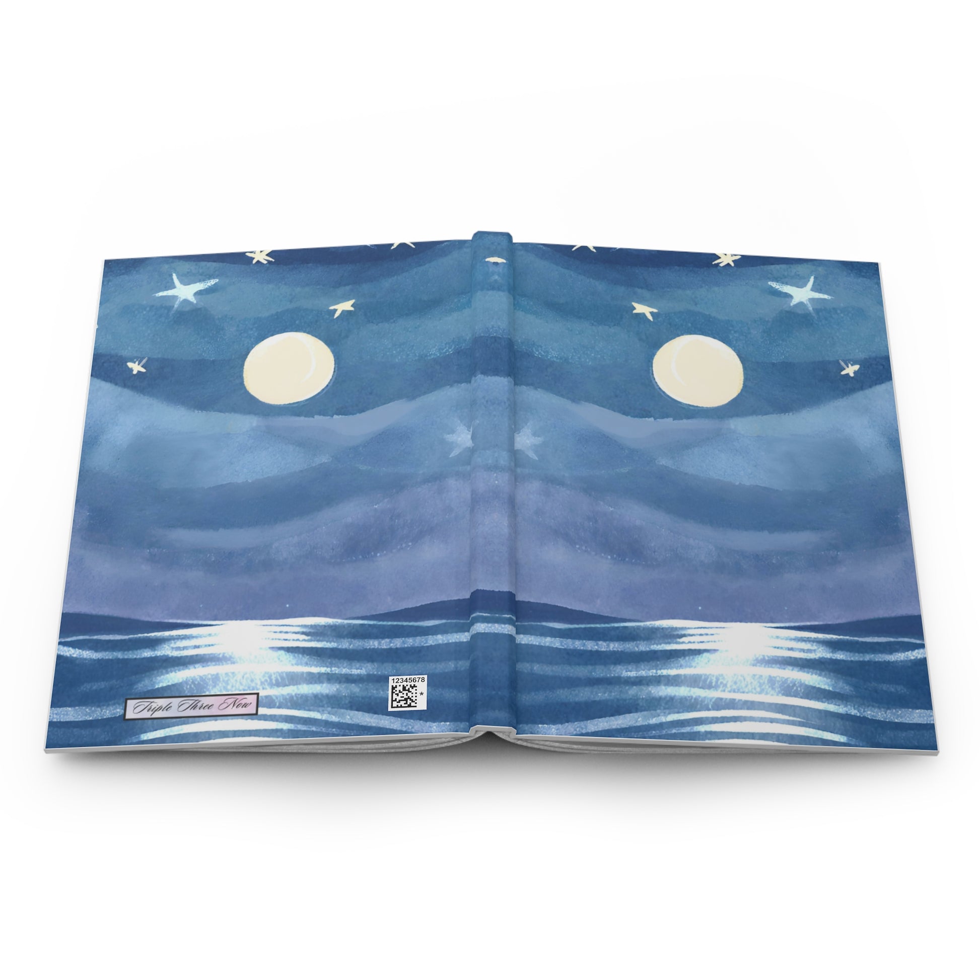 A soft, moonlit journal that invites quiet evenings and gentle reflection. The matte-laminated hardcover wraps a shimmering seascape—brushstroked waves, a glowing moon, and scattered stars—bringing a calm, painterly vibe to your desk or bedside. The sewn casewrap binding lets the book lie comfortably open while you write. Inside: 150 lined pages with perforations for easy removal, and a full-wrap print so the artwork continues uninterrupted from front to back. Lightweight and durable, it feels like a private little ritual: sketch, plan, or pour out thoughts beneath a painted night sky.