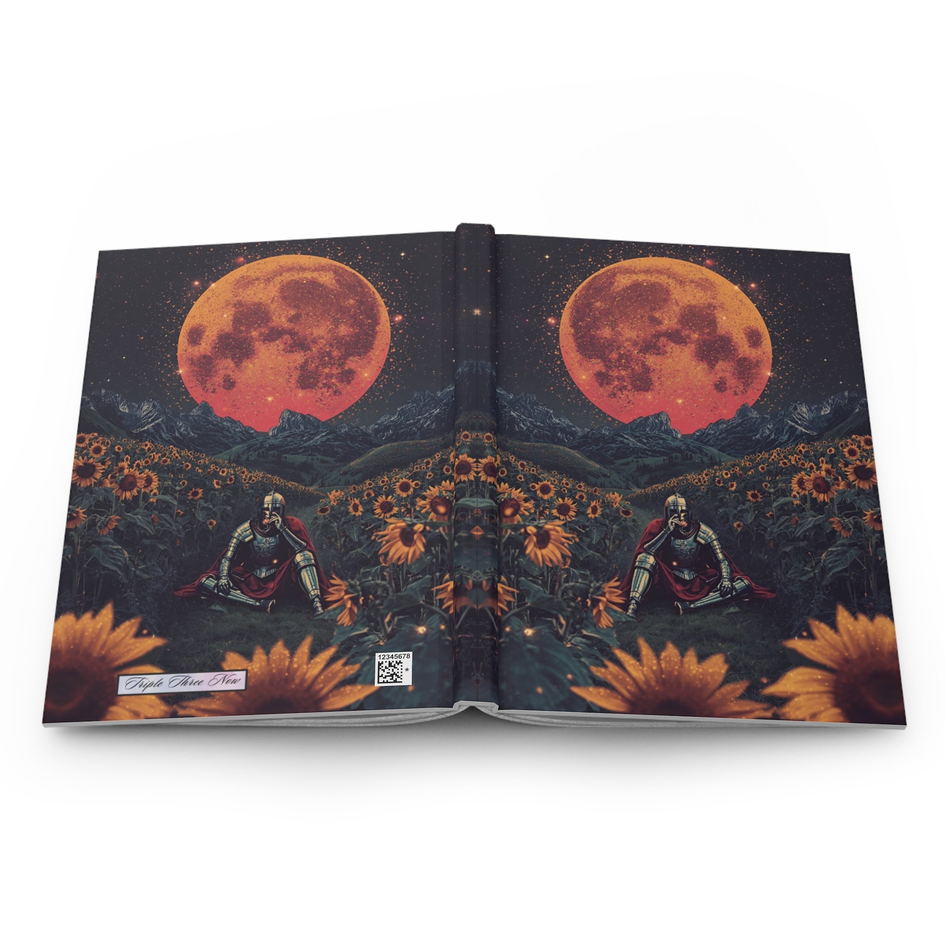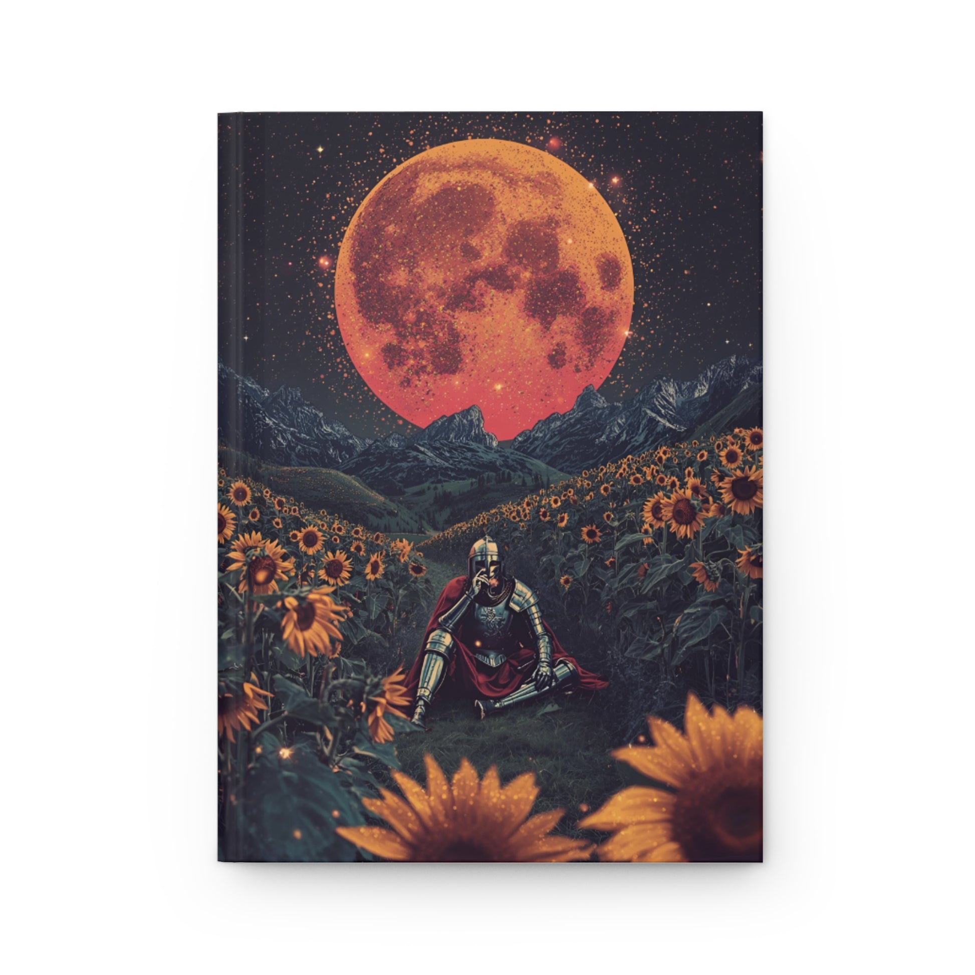 A matte-covered journal that feels like stepping into a late-night reverie. The full-wrap print places you in a sunflower field beneath a huge, red-hazed moon, where a lone armored figure rests among the blooms. The mood is quiet and cinematic — the kind of place where ideas land on the page as sketches, lists, or midnight poems. The casewrap binding gives the spine a gentle flexibility so the book opens flat when you write. Inside, 150 lined pages with perforations let you draft, tear, and share without worrying about durability. The matte laminated cover keeps colors vivid while softening glare, so the artwork looks rich and tactile on a daily basis.