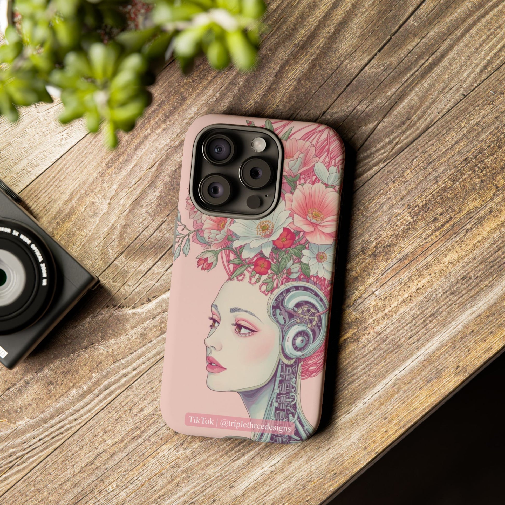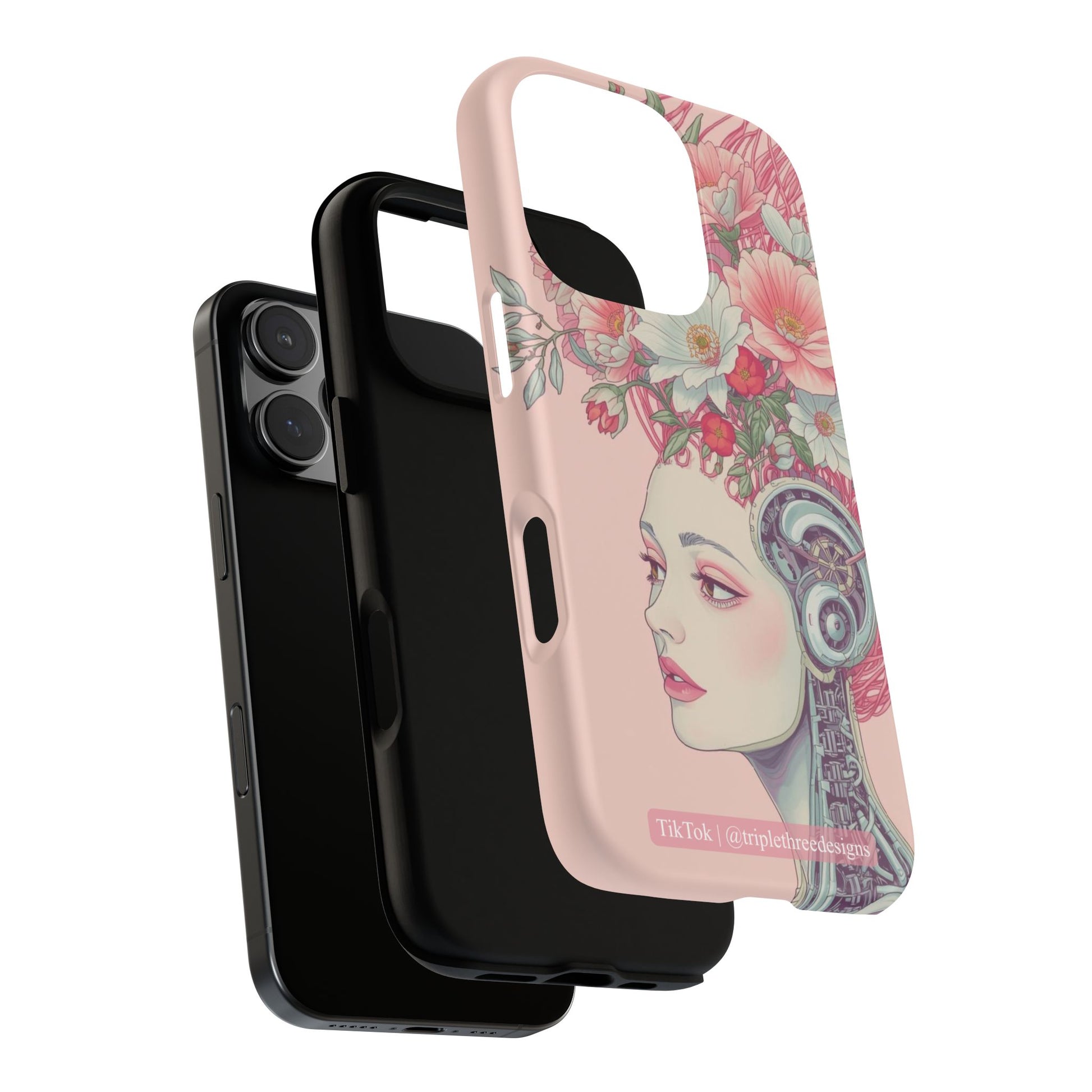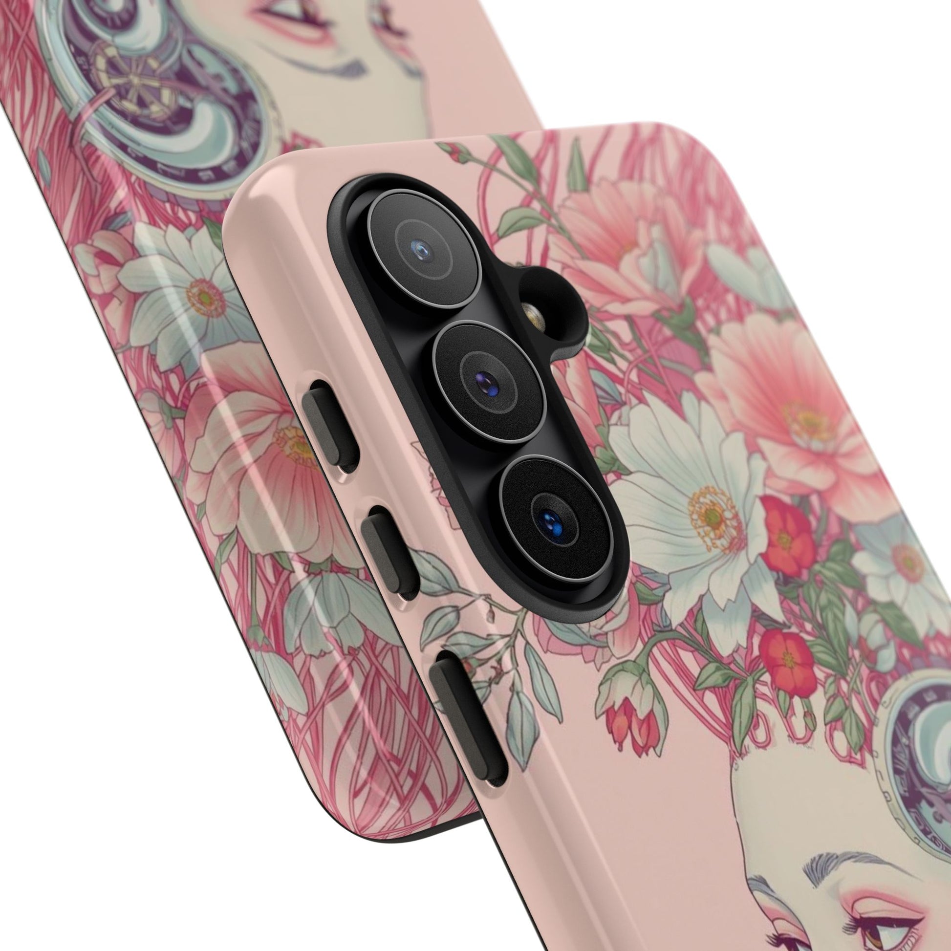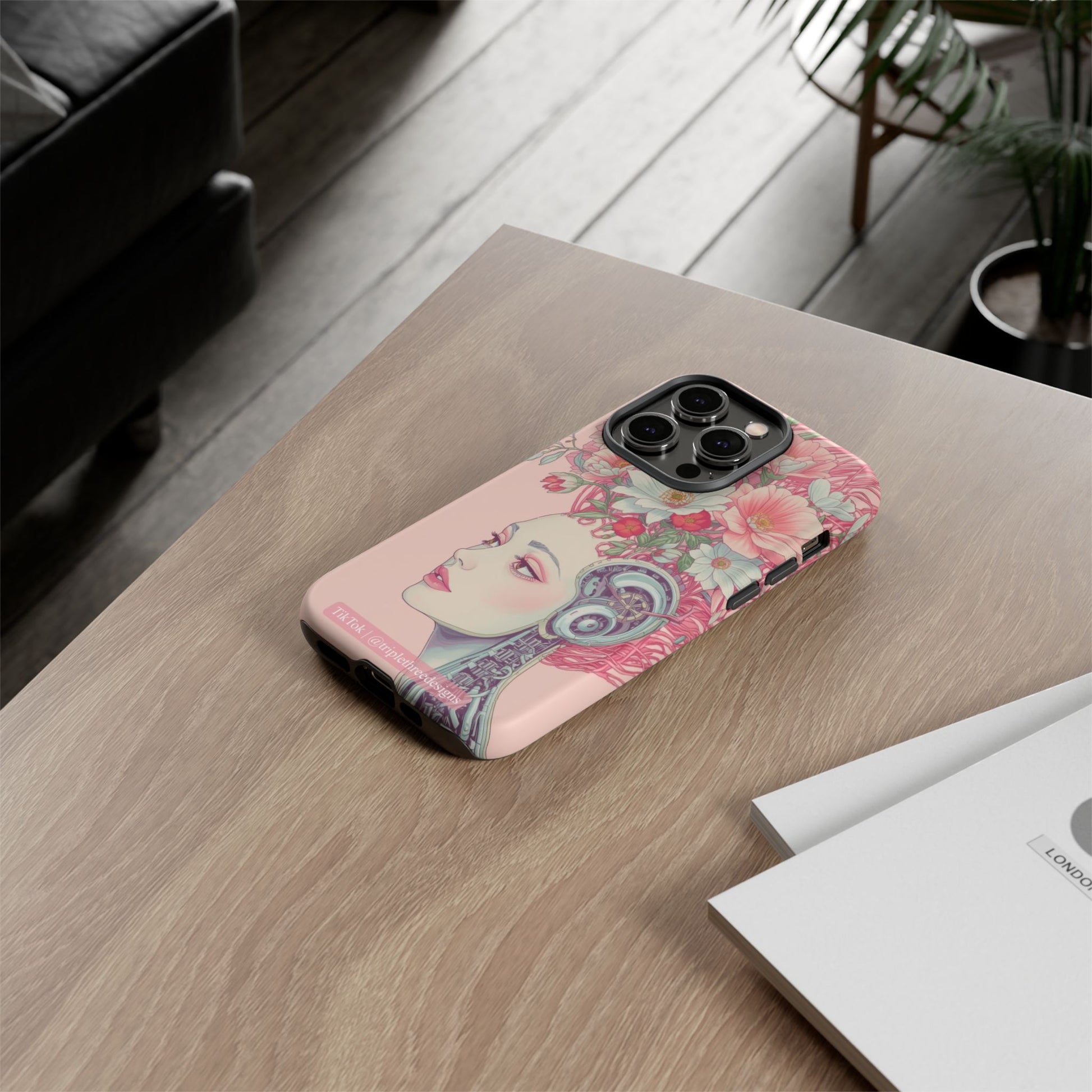 A slim, dual-layer protective phone case that blends delicate botanical art with soft, futuristic beauty. The design wraps fully around the case, showcasing a visionary portrait crowned with blooming flowers and fine mechanical details—soft pinks and muted greens give it a calm, romantic mood. It wears like a little piece of art on your phone: light in hand, reassuring against knocks, and finished in your choice of glossy or matte for a refined look. Built for everyday life, it resists UV fade and supports wireless charging while keeping ports clear. This case belongs with someone who appreciates delicate illustration, subtle tech motifs, and reliable protection for daily adventures.