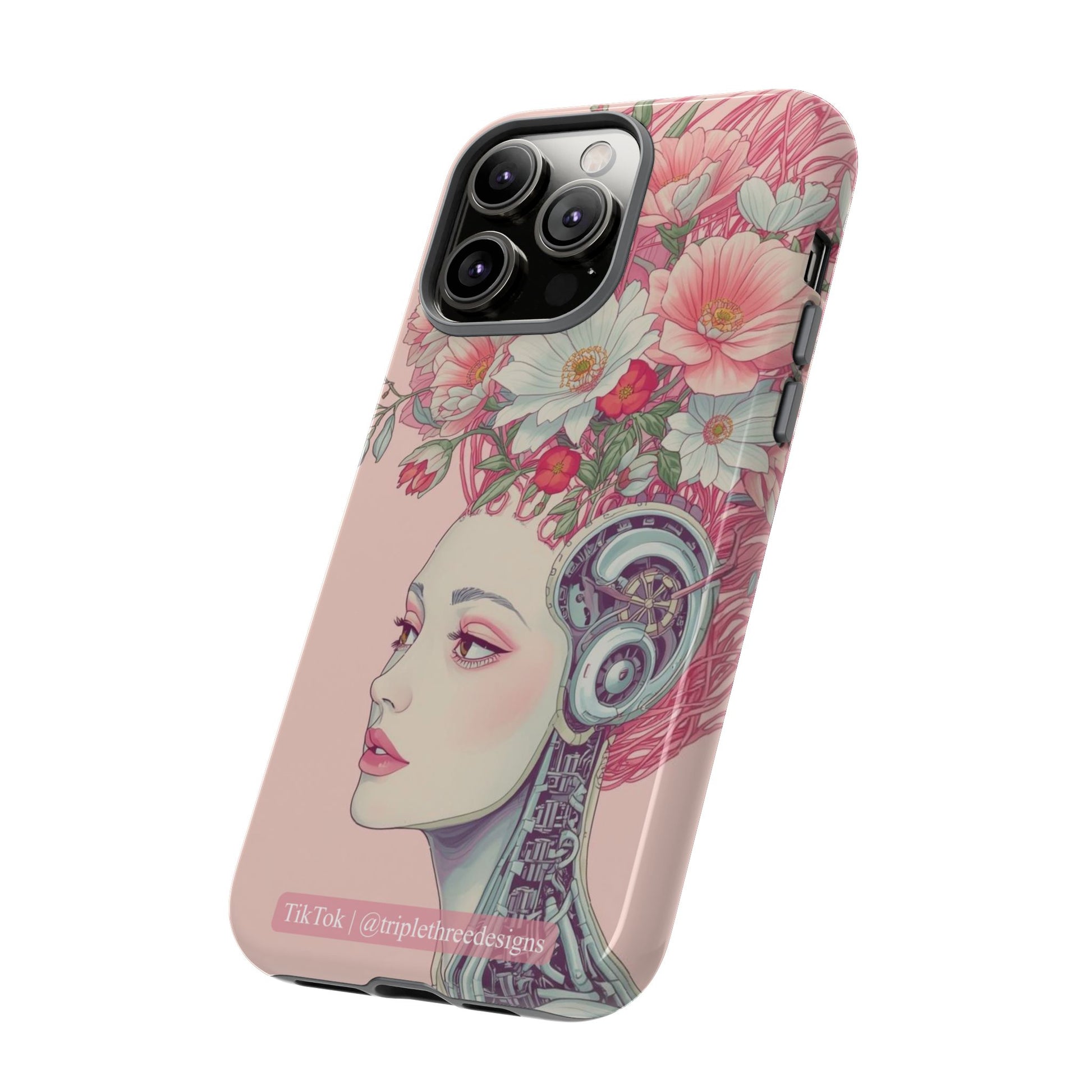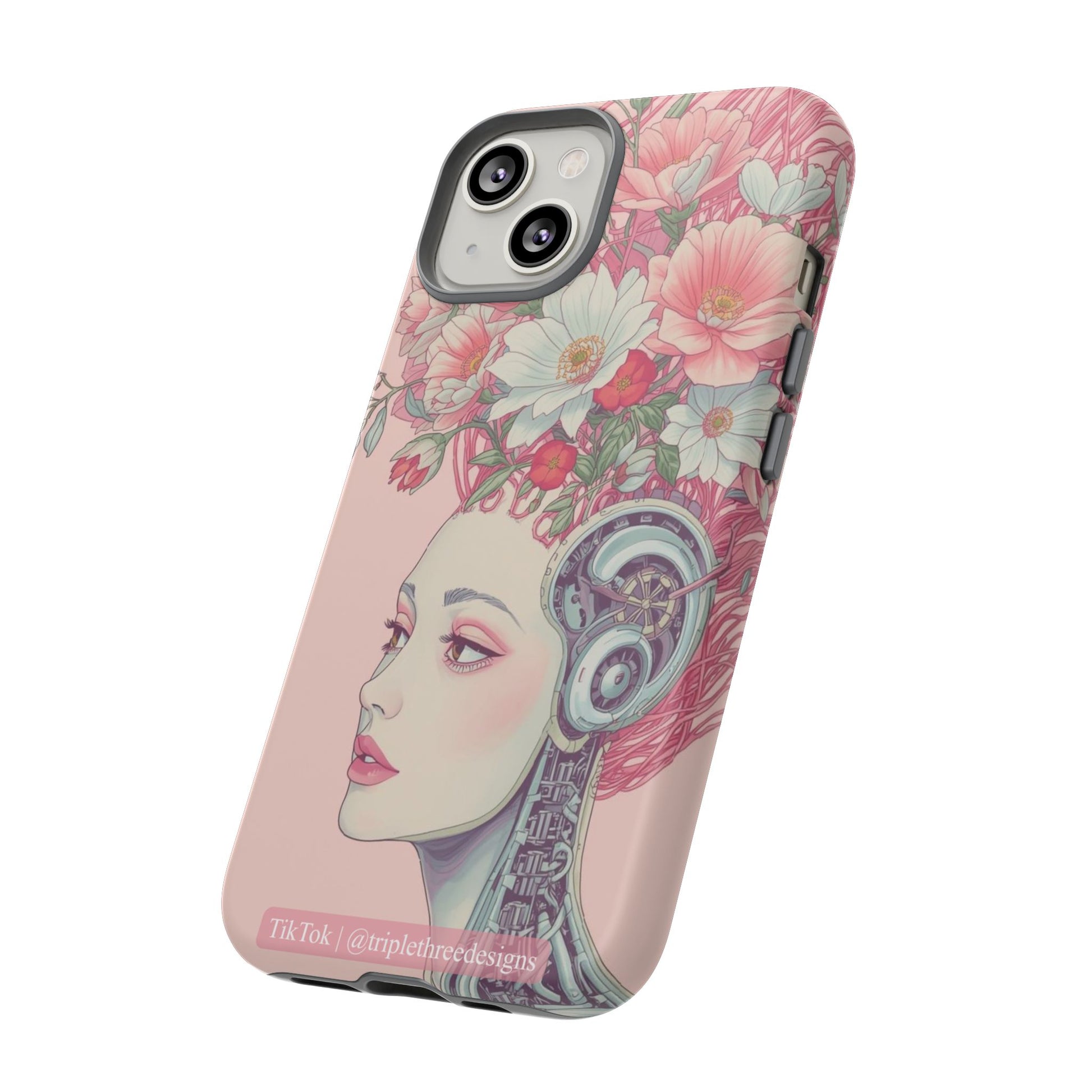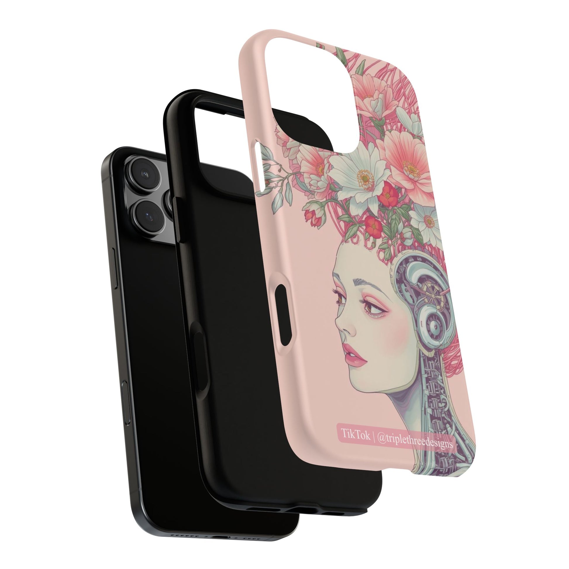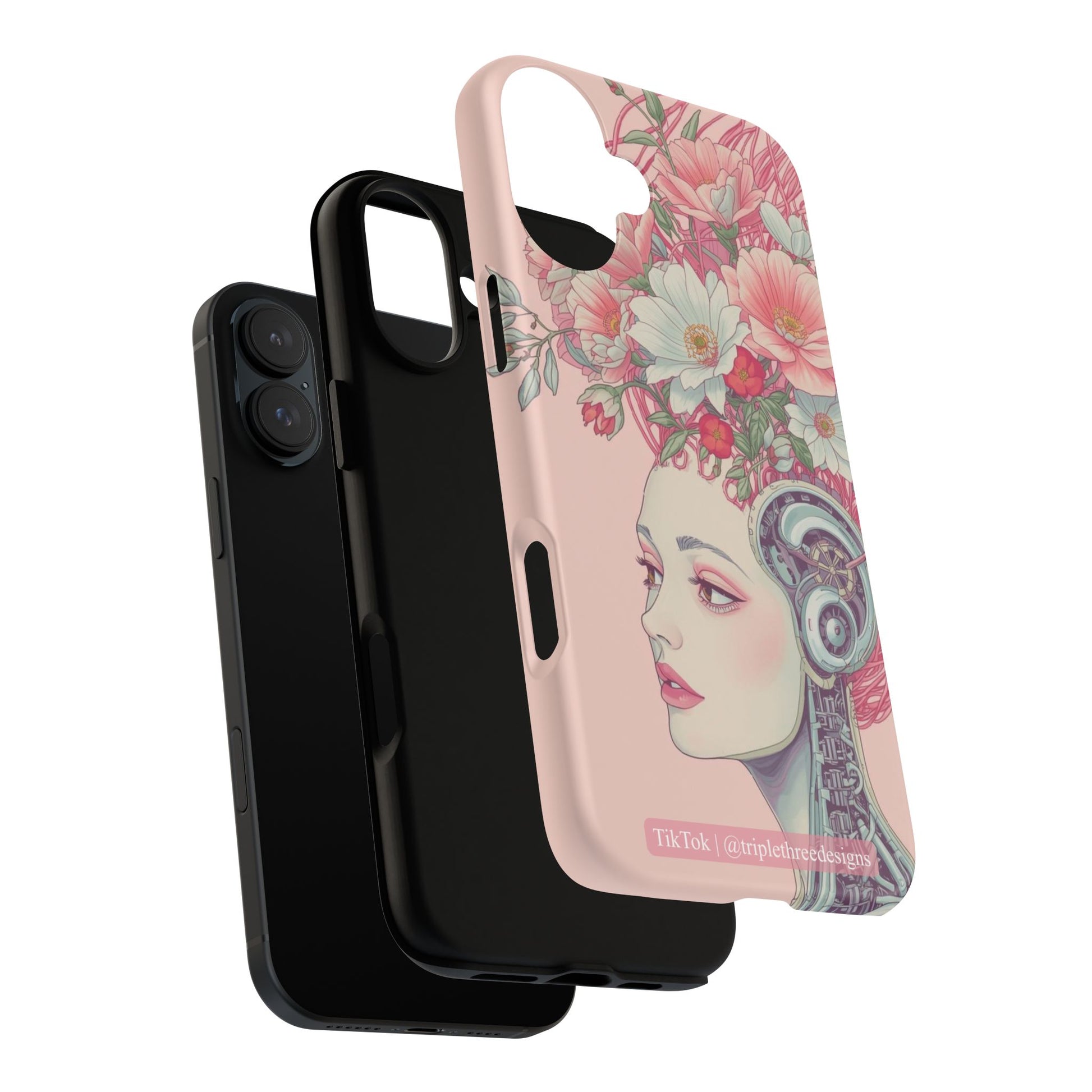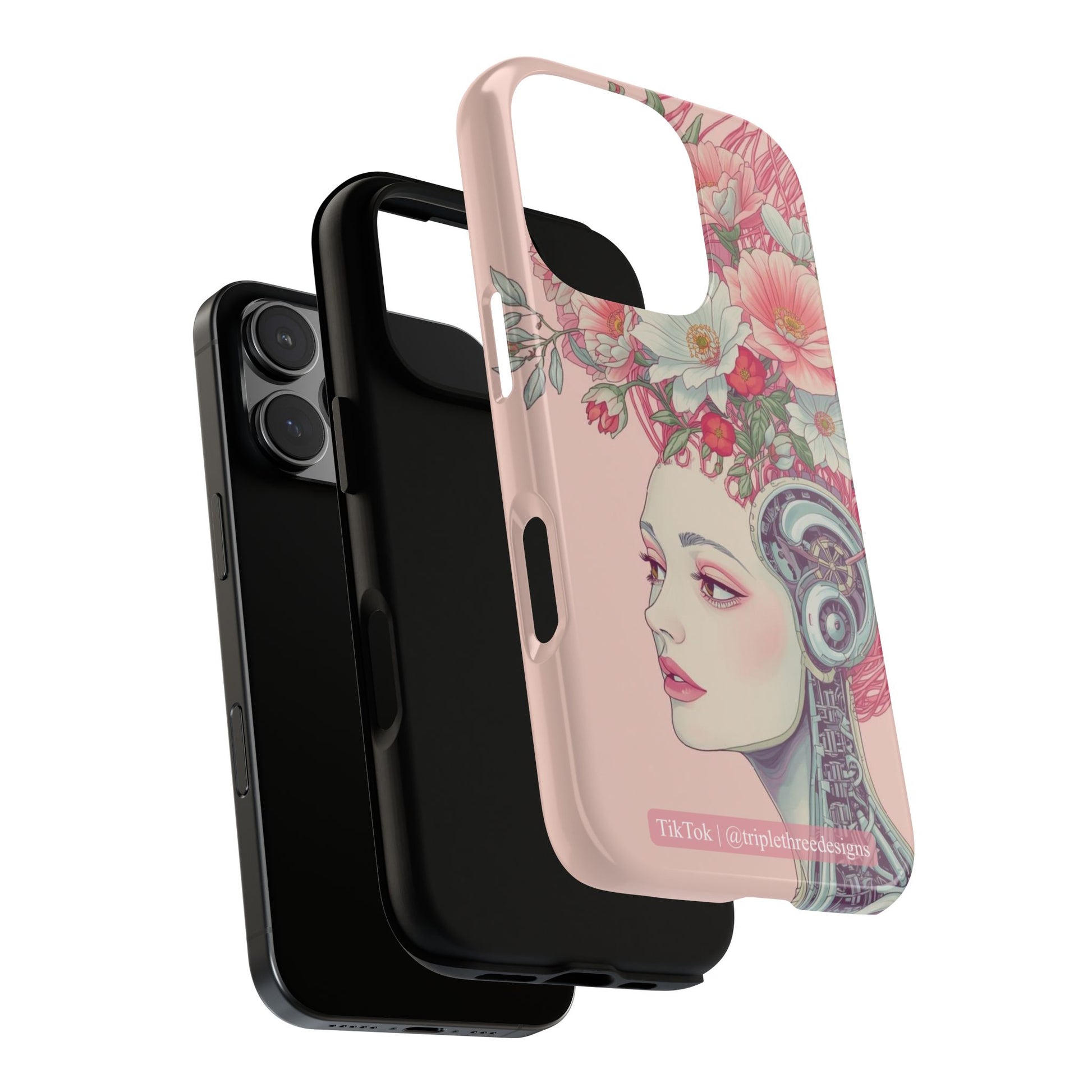 A slim, dual-layer protective phone case that blends delicate botanical art with soft, futuristic beauty. The design wraps fully around the case, showcasing a visionary portrait crowned with blooming flowers and fine mechanical details—soft pinks and muted greens give it a calm, romantic mood. It wears like a little piece of art on your phone: light in hand, reassuring against knocks, and finished in your choice of glossy or matte for a refined look. Built for everyday life, it resists UV fade and supports wireless charging while keeping ports clear. This case belongs with someone who appreciates delicate illustration, subtle tech motifs, and reliable protection for daily adventures.