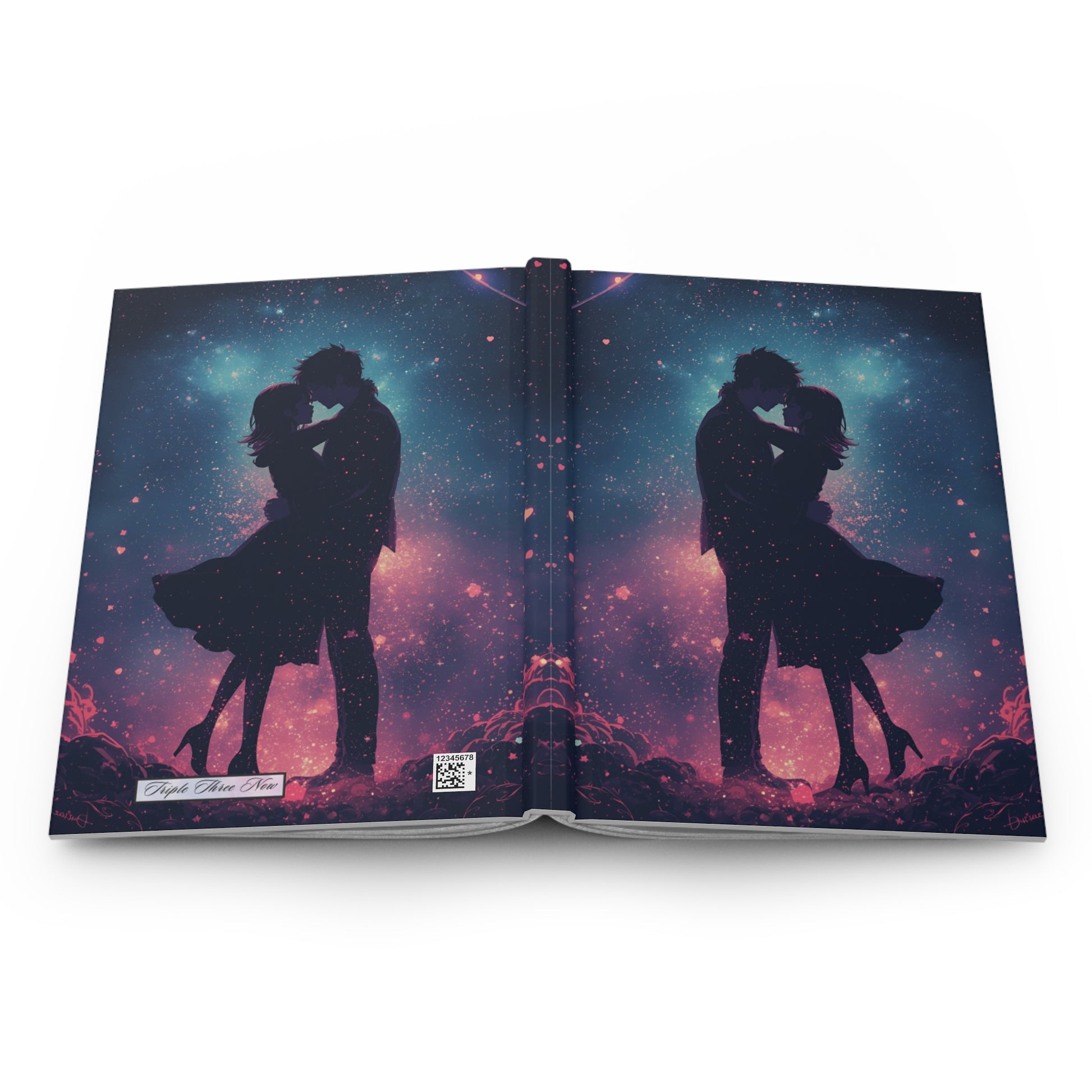A matte hardcover journal that feels like a private night sky. The cover shows two silhouettes locked in a gentle embrace against a swirling galaxy of deep navy, magenta, and starlight—quiet, romantic, and a little bit cinematic. Inside are 150 lined pages with perforations so thoughts can be shared or removed. The sewn casewrap binding keeps the book flexible and lays flat for easy writing. Durable matte lamination protects the vivid full-wrap artwork while keeping the surface soft to the touch. This journal sits well on a bedside table, in a tote for late-night cafe sketches, or tucked into a travel bag for handwritten letters and plans.