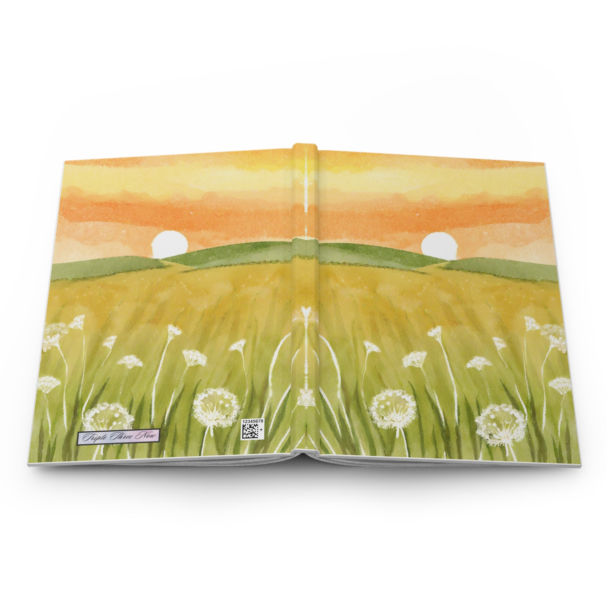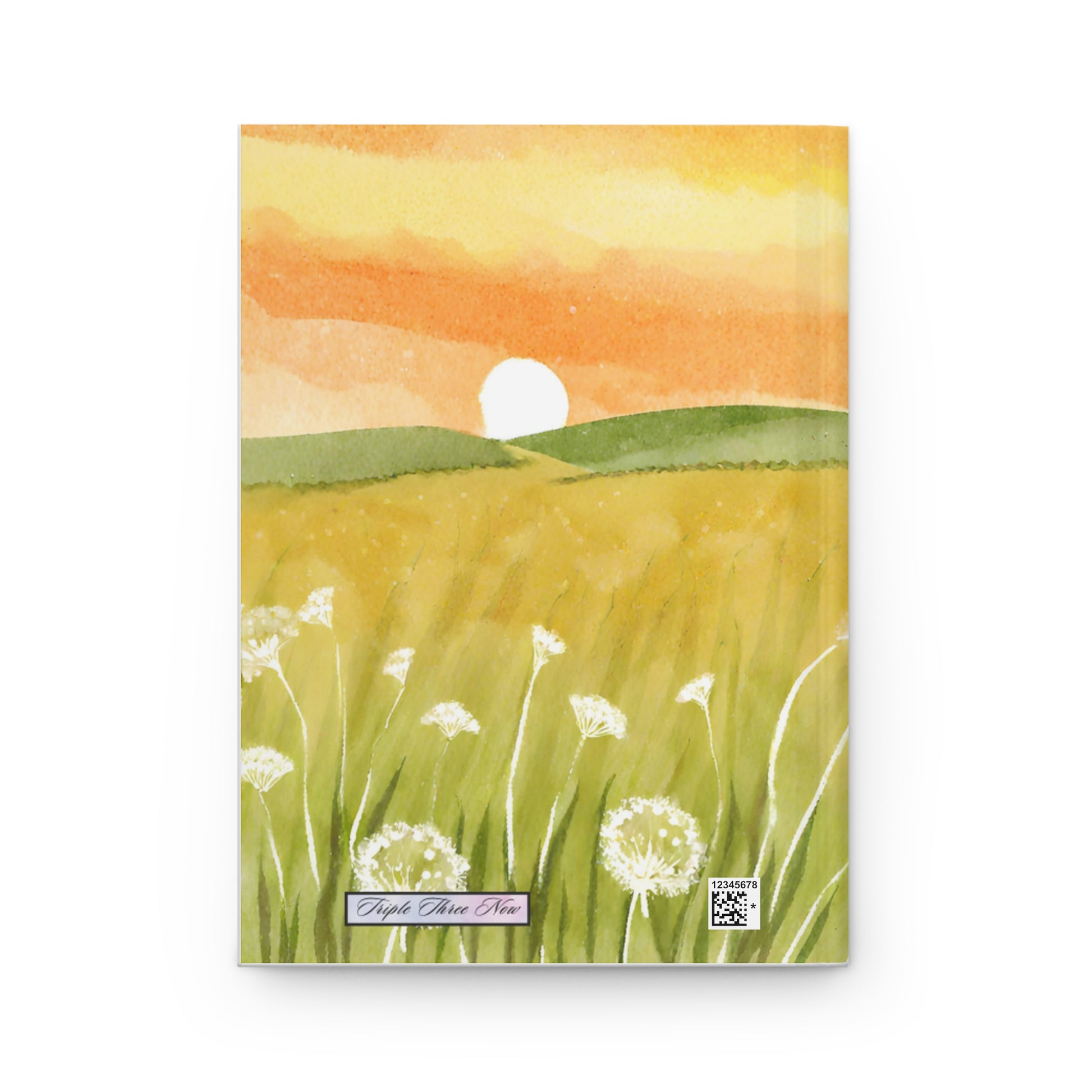 A hardcover journal that feels like a quiet walk through a summer meadow at sunrise. The matte-laminated cover shows a soft watercolor scene: warm orange skies, rolling green hills, and dandelions catching the breeze. Inside, 150 lined pages with perforations let ideas be kept or shared. The sewn casewrap binding keeps the book flexible and lays flat enough for comfortable writing. Bright, full-wrap printing preserves every brushstroke and color gradation, while the matte finish gives the cover a soft, tactile presence you’ll enjoy holding. Bring this journal to morning pages, sketching sessions, or wherever you collect thoughts and small plans.